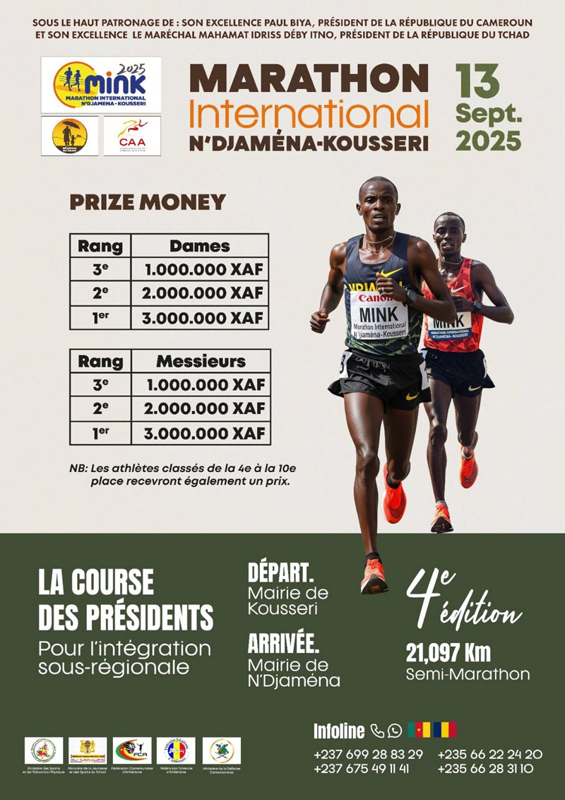 Le marathon international Ndjamena-Kousseri dénommé la "course des présidents pour l'intégration sous-régionale", initialement prévu le 6 septembre 2025, se déroulera finalement le 13 septembre 2025, en raison de contraintes indépendantes de la volonté du comité d'organisation présidé par l'honorable Dr Kamssouloum Abba Kabir.